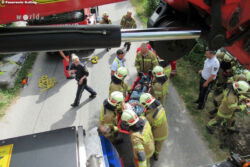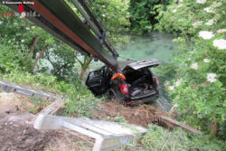 Nachdem die eingeklemmten Beine der Person befreit werden konnten, wurde der Abtransport schonend mit der Korbtrage über den Hang durchgeführt. Der Unfalllenker kam mit Verletzungen unbestimmten Grades in das Krankenhaus. Für die Bergung des Unfallfahrzeuges unterstützte die Wasserrettung Bischofshofen die örtlichen Kräfte mit den technischen Sicherungsarbeiten im Wasser, der Pkw konnte danach rasch durch zwei Kräne der Feuerwehr und des Abschleppdienstes aus dem Wasser des Bluntaubachs geborgen werden. Nach 2,5 Stunden konnte dieser Einsatz erfolgreich beendet werden.