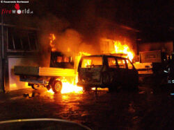 Bei Eintreffen der ersten Einheiten konnten zwei Brandstellen festgestellt werden. Zwei Pkw brannten auf einem Parkplatz, in der Zufahrt zu einer Lagerhalle, in voller Ausdehnung. Der Brand hatte aufgrund der enormen Hitzeentwicklung bereits auf zwei weitere Fahrzeuge übergegriffen. In gut 100 Meter Entfernung zu dieser Brandstelle, konnte ein weiterer Brand an insgesamt drei Kleintransportern, direkt an der Fassade einer Lagerhalle, festgestellt werden. Auch dieser Brand breitete sich bereits auf weitere Kleintransporter und auf die Lagerhalle aus.