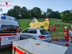 Die Einsatzkräfte des Roten Kreuzes haben die Verletzten versorgt und gleichzeitig wurde von der Einsatzleitung des Roten Kreuzes die Organisation der Verletzten-Transporte per Rettungshubschrauber & Fahrzeugen simuliert.