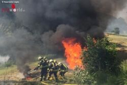 Aufgrund der Trockenheit breitete sich das Feuer schnell in der Umgebung sowie auf Heumieten aus, zum Glück konnte der Landwirt die Zugmaschine abkuppeln und vor den Flammen in Sicherheit bringen. Aufgrund der gegeben Örtlichkeiten hat der Einsatzleiter die wasserführenden Fahrzeuge der Einheiten Elbrinxen und Sabbenhausen nachalarmiert.