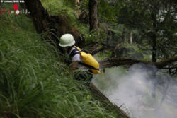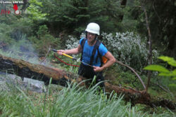 Die Heli-Besatzung flog dann in zwei Aufzügen im Netz am Tau weitere Ausrüstung von Baumgarten aus auf den Berg, unter anderem einen Faltbehälter, der dann per Außenlastbehälter mit dem Heli mit Wasser des nahen Saalachsees gefüllt wurde. Während der Heli aus der Luft löschte, gingen die Fußmannschaften im Bergwald bodengebunden gegen den Brand vor. Die Bergwacht kümmerte sich währenddessen mit Seilgeländern um die Absturzsicherung für den bevorstehenden Abstieg, da die steilen Grasleiten und der Steig durch den Regen ziemlich rutschig wurden.