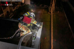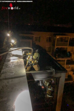 LINZ (OÖ): Auf einem Balkon im fünften Obergeschoss ist es in Linz in der Nacht auf den 1. Juli 2019 zu einen Brand gekommen. Die Feuerwehr brachte parallel zum Vorgehen mit Atemschutz über das Stiegenhaus eine Drehleiter in Stellung.