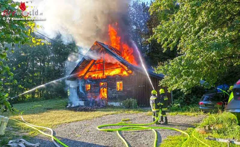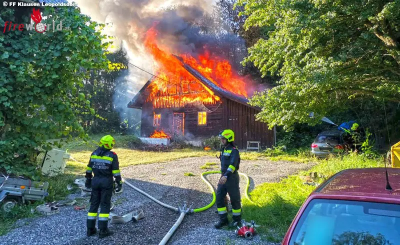 Anfänglich wurde gegen 18:20 Uhr über Notruf 122 bei der Feuerwehr ein Waldbrand hinter einem Wohnhaus gemeldet. Als die ersten Einsatzkräfte der FF Klausen Leopolsdorf vor Ort eintrafen stellte sich jedoch heraus nicht der Wald brannte, sondern ein Holzschuppen der als Lager dient stand direkt neben den Bäumen bereits zum größten Teil in Vollbrand. Sofort lies der Feuerwehreinsatzleiter die Alarmstufe von B2 auf B3 erhöhen, da die Gefahr eines Übergreifens auf das unmittelbar angrenzende Waldgebiet drohte