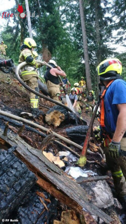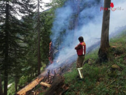 In weiterer Folge fing der umliegende Waldboden ebenfalls Feuer und die Flammen konnten sich – begünstigt durch die lange Trockenperiode – rasch ausbreiten. Nach der mehrminütigen Anfahrt über die steile Feuerkogel-Forststraße wurde die Lage erkundet und per Hand eine rund 250 Meter lange Löschleitung entlang eines Wanderweges gelegt. Die Wasserversorgung wurde durch eine nahegelegene Wasserleitung für die Schneekanonen der Feuerkogelseilbahn sichergestellt. Mittels einer Motorsäge wurden mehrere Bäume stückweise abgelängt und abgelöscht. Aufgrund des steilen und lockeren Terrains stürzten immer wieder Felsbrocken auf die darunterliegende abgesperrte Forststraße. Natürlich wurde, wenn es die Gegebenheiten forderten, die Einsatzmannschaft während den Löscharbeiten durch eine Absturzsicherung abgesichert.