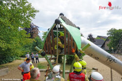 RATINGEN (DEUTSCHLAND): Am Nachmittag des 3. Juli 2019 klemmte sich ein sieben Jahre altes Kind in einem Spielgerät den Arm ein. Weil die Berufsfeuerwehr parallel bei zwei Verkehrsunfällen im Einsatz war, wurde die Freiwillige Feuerwehr zur Befreiung des Kindes alarmiert.