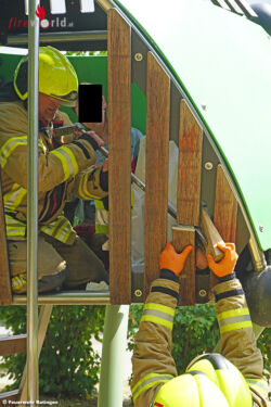 Dabei wurde das Kind über die Maßnahmen stets aufgeklärt, durch eine Decke geschützt und weiterhin durch die Notärztin betreut. Dies war in diesem Falle besonders wichtig, da die Säbelsäge beim Durchtrennen der Strebe sowohl starke Vibrationen als auch eine hohe Geräuschemission verursachte. Nachdem die Strebe durchtrennt war, konnte sie mit Hilfe von Keilen und dem sogenannten Halligan-Tool entfernt werden.