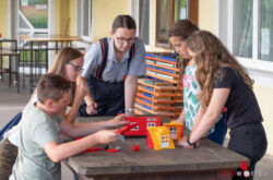 - "Funken" war ebenfalls Thema einer Station, bei der ihnen grundlegendes Wissen zum Funksystem in der Feuerwehr erklärt wurde. Danach durften sie auch selber Hand anlegen, indem ein paar SchülerInnen die Bauanleitung eines Lego Duplo Feuerwehrhauses per Funk durchgeben mussten und ihre KollegInnen anhand dieser Anweisungen zu BaumeisterInnen wurden.