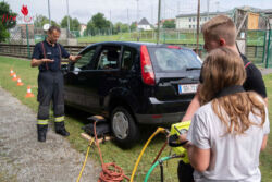 - Bei der Station "technische Geräte" bekamen die Jugendlichen einen Einblick in die Technik bei der Feuerwehr. So wurde ihnen die Handhabung mit Schere und Spreizer sowie mit dem Hebekissen gezeigt. Spielerisch durften sie diese Geräte zum Teil auch selber ausprobieren.
