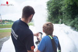 - Beim "Löschen mit Schaum" wurde den SchülerInnen erklärt, bei welchen Bränden man mit Wasser alleine nicht auskommt und daher Schaum benötigt, um effektiv löschen zu können. Um ihnen auch vor Augen zu führen, wie das in der Praxis aussieht, wurde im Anschluss eine Schaumdecke hergestellt.