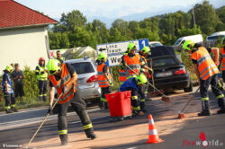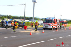 Die Feuerwehr wurde zu einer Ölspur alarmiert. Am Einsatzort zeigte sich, dass es sich um einen heftigen Zusammenstoß zwischen zwei Pkw handelte. Der Rettungsdienst wurde ebenso benötigt. Die Feuerwehr sicherte die Unfallstelle ab, band ausgelaufene Betriebsmittel und unterstützte bei den Aufräumarbeiten. Der Verkehr wurde durch die Polizei abwechselnd an der Unfallstelle vorbeigeleitet. Es kam zu kurzzeitigen Verkehrsverzögerungen.