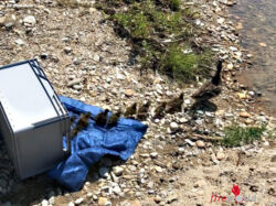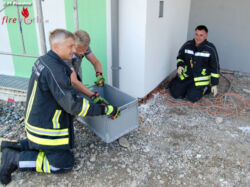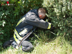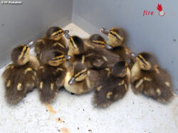 Die fünf Entenküken flüchteten in eine angrenzende Baustelle, wo sie ebenfalls eingefangen werden konnten. Nach einigen Minuten konnte auch die Entenmutter mit Decken in eine Ecke gedrängt und eingefangen werden. In einer Transportkiste wurde die Entenfamilie zum Hochwasserrückhaltebecken gebracht und in einer sicheren Umgebung wieder in die Freiheit entlassen.