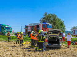 ALKOVEN (OÖ): „Verkehrsunfall, Person eingeklemmt – B 129, Höhe Avanti Tankstelle“. Das waren um 14.24 Uhr des 24. Juli 2019 die Alarmstichworte für die beiden Alkovener Feuerwehren.Vor Ort wurden die Alkovener Einsatzkräfte auf einen havarierten Pkw sowie einem auf der Bundesstraße stehenden Lkw aufmerksam.