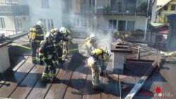 Nachbarn wurden auf einen Brand auf der Terrasse eines Mehrparteienhauses aufmerksam. Sie alarmierten die Freiwillige Feuerwehr über Notruf 122 und eilten mit fünf Handfeuerlöschern zu Hilfe. Leider breitete sich der Brand in der Zwischenzeit auf den Dachstuhl aus. Ein Bewohner des oberen, vom Brand betroffenen Stockwerkes, konnte rechtzeitig aus seiner Wohnung flüchten und kam mit dem Schrecken davon.