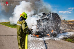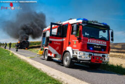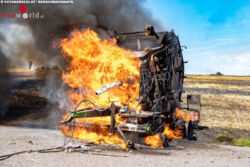 Eine Strohpresse, mehrere Strohballen sowie Teile des Feldes standen in Vollbrand. Laut Einsatzkräften umfasst die abgebrannte Fläche etwa zwei Hektar.
