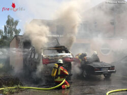 Unter Atemschutz konnte der Brand mit zwei C-Rohren zügig eingedämmt werden und eine Ausbreitung des Brandes auf das Innere der Garage verhindert werden. Der Außenbereich der Garage wurde in Mitleidenschaft gezogen. Die zwei Fahrzeuge brannten allerdings aus. Der durch die Garage in das Wohnhaus gezogene Brandrauch musste mit einem Drucklüfter entfernt werden. Im Gebäude wurden mit einem Messgerät Kohlenmonoxid Messungen durchgeführt so das dieses gefahrlos im Anschluss wieder betreten werden konnte.