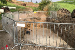 SCHWERTBERG (OÖ): Kurz vor 19 Uhr wurde die Freiw. Feuerwehr Schwertberg am 2. August 2019 aufgrund des Starkregens zur Baustelle vom Rückhaltebecken auf der Broatn alarmiert. Um eine Überflutung der Pergerstaße zu verhindern, war es notwendig, die Baugrube mittels Schmutzwasserpumpe auszupumpen.