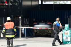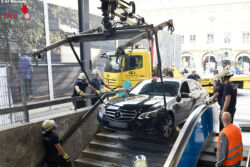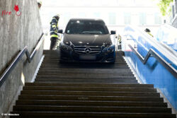 Die U-Bahn Wache bemerkte den Unfall, sperrte den betroffenen Bereich ab und alarmierte die Feuerwehr. Beim Eintreffen der Einsatzkräfte standen nur noch die Hinterreifen der Mercedes E-Klasse auf der obersten Stufe des Abgangs. Der aus Frankreich stammende Fahrer und seine Beifahrerin waren bereits unverletzt aus dem Fahrzeug ausgestiegen. Die Besatzung eines Hilfeleistungslöschfahrzeuges sicherte bis zum Eintreffen eines Bergungsunternehmens das Fahrzeug gegen weiteres Abrutschen. Nachdem das Abschleppunternehmen das Auto aus dem Abgang herausgehoben hatte, konnte es den Besitzern übergeben werden. Am Fahrzeug entstand augenscheinlich nur geringer Schaden, wodurch die Eigentümer die Fahrt fortsetzen konnten.