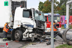 WELS (OÖ): Ein schwerer Zusammenstoß zwischen zwei Lkw hat sich Dienstagvormittag, 6. August 2019, in Wels-Pernau ereignet. Die Lenker der beiden Schwerfahrzeuge wurden verletzt, ein Holztransporter ist umgestürzt.