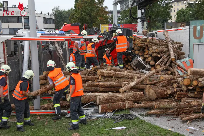 Oö: Holztransporter bei Zusammenstoß zweier Lkw in Wels umgestürzt