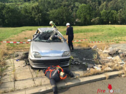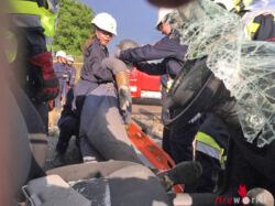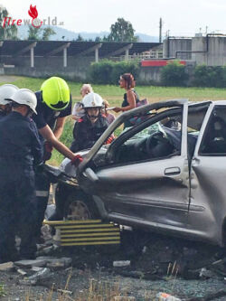 Vor dem Abendessen ging ein weiterer Alarm ein. Dabei wurde ein Verkehrsunfall mit einer eingeklemmten Person im Pkw und einer weiteren Person unter dem Fahrzeug simuliert. Der Pkw musste stabilisiert und der Brandschutz aufgebaut werden. Mit den hydraulischen Rettungsgeräten und Hebekissen wurden die verunfallten Personen gerettet.