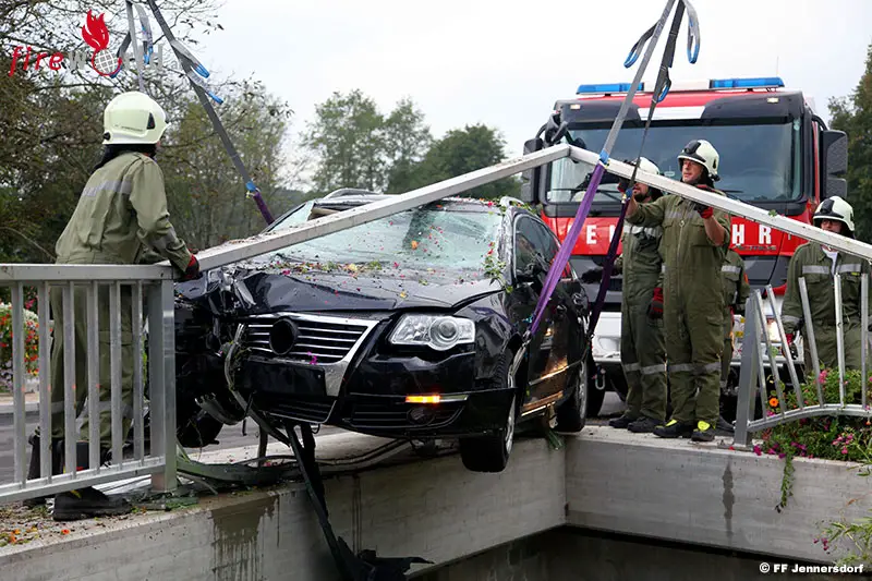 Das Brückengeländer aus Metall verhindert, dass der schwer beschädigte Kombi in den darunter fließenden Bach stürzte. Die FF St. Martin an der Raab rückte unter dem Kommando des neuen Ortsfeuerwehrkommandanten Martin Brückler zum Einsatzort aus und sicherte den Pkw gegen den drohenden Absturz.