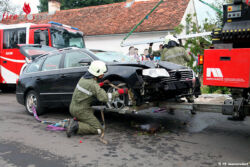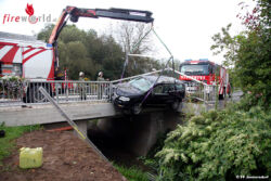Außerdem mussten ausgetretene Betriebsmittel im Gewässer mit einem sogenannten „Ölbindemittel“ entfernt werden. Zur Fahrzeugbergung wurde die Feuerwehr Jennersdorf nachalarmiert, welche das Unfallwrack mit dem Kran des schweren Rüstfahrzeuges vom beschädigten Brückengeländer hob und es mit der Abschleppbrille des SRF bis zum nächsten, gesicherten Abstellplatz verbrachte.
