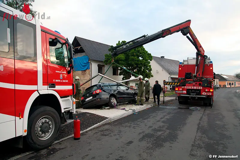 Das Brückengeländer aus Metall verhindert, dass der schwer beschädigte Kombi in den darunter fließenden Bach stürzte. Die FF St. Martin an der Raab rückte unter dem Kommando des neuen Ortsfeuerwehrkommandanten Martin Brückler zum Einsatzort aus und sicherte den Pkw gegen den drohenden Absturz.