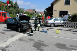 WELS (OÖ): Ein heftiger Kreuzungscrash zwischen zwei Autos in Wels-Pernau forderte Dienstagmittag, den 3. September 2019, zwei Verletzte. Eines der Unfallfahrzeuge landete nach dem Crash in einem Garten.