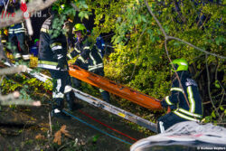 Da sich die dritte Person auf der Rückbank des Unfallfahrzeuges nicht selbst befreien konnte, mussten die Feuerwehren hydraulische Rettungsgeräte einsetzen. Über den Kofferraum wurde eine Rettungsöffnung für eine möglichst patientenschonende Befreiung geschaffen. Während der technischen Rettung wurde die junge Frau im Fahrzeug von Feuerwehr und Rettungsdienst bzw. Notarzt betreut, mit vereinten Kräften konnte sie nach rund 30 Minuten befreit werden.
