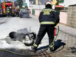 Erste Versuche von couragierten Verkehrsteilnehmern, welche zwei mitgeführte Pulverlöscher für den ersten Löschversuch einsetzten, zeigten bis zum Eintreffen der Feuerwehr ihre Wirkung. Unter Vornahme einer Schnellangriffsleitung führten die Feuerwehrmänner die Löscharbeiten durch und bargen im Anschluss die Vespa mit dem Abschleppfahrzeug.