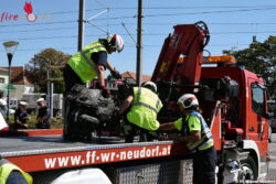 WIENER NEUDORF (NÖ): Zu Mittag des 4. September 2019 wurde die Freiwillige Feuerwehr Wiener Neudorf mit dem Alarmbild „Motorrad in Vollbrand nach Verkehrsunfall“ in die Schillerstraße alarmiert.