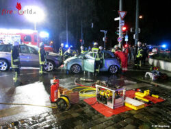 Nur etwa eineinhalb Stunden später krachte es erneut, nur wenige hundert Meter entfernt. An der Ecke Schaezlerstraße/Alter Einlass kam ein Pkw von der Fahrbahn ab, traf einen Baumund blieb auf der Seite liegen. Da das Dach stark eingedrückt war, konnten sich die Insassen nicht selbstständig befreien. Auch hier kam hydraulisches Rettungsgerät zum Einsatz. Das Dach wurde entfernt, die Verletzten aus dem Fahrzeugwrack geborgen undins Klinikum transportiert.