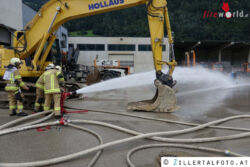 Gleichzeitig wurde das Team des TLF mit einer heiß gewordenen Acetylengasflasche in einem Industriebetrieb konfrontiert. Der Brand wurde bereits durch die Mitarbeiter gelöscht, jedoch musste beim Schweißgas vom schlimmsten ausgegangen werden. So wurde eine Kühlung der Flasche aus der Deckung eines Baggers vorgenommen. Nachdem die Flasche ausreichend gekühlt war und mit Wärmebildkamera und IR-Messgerät keine weitere Erwärmung der Flasche durch eine mögliche Zersetzung des Gases festgestellt wurde, konnte die Flasche in ein Wasserbad geben werden um sie dort weiter zu kühlen.