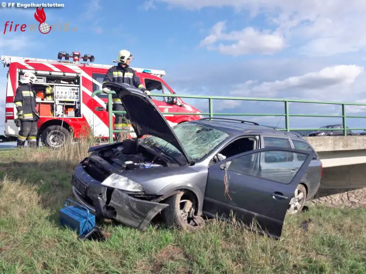 Aus bisher noch ungeklärter Ursache kam ein Fahrzeug gegen 16:40 Uhr von der Fahrbahn ab, raste durch ein Sonnenblumenfeld, hob bei einem Erdhügel zum Flug über einen Abzugsgraben ab und kam neben einer Brücke zum Stillstand.