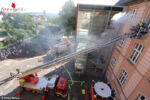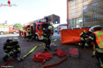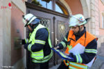 Mehr als 30 Brandschützer rückten zu dem fiktiven Großbrand der Bildungseinrichtung aus. „Es brennt im dritten Obergeschoss, mehrere Schüler sind von Rauch und Flammen eingeschlossen“, schilderte Stadtbrandinspektor Daniel Schäfer vor Ort.