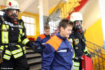 Mit Abschluss der Erkundung ging es für die Mannschaften der Löschfahrzeuge im Befehlston weiter. Mit wenigen und kurzen Worten vermittelten die Gruppenführer ihren Kameraden den gespielten ernst der Lage. „Menschenleben in Gefahr, Angriffstrupp mit Sprungretter vor“, so beispielsweise der Befehl für einen der teilnehmenden Feuerwehrtrupps. Ohne Nachfragen oder fragende Blicke setzte sich danach binnen Sekunden eine Rettungsmaschinerie in Gang. Während ein gigantisches Luftpolster im Hof der Schule aufploppte, wurde wenige Meter entfernt eine Drehleiter in Stellung gebracht. Zeitgleich drangen mehrere Feuerwehrleute mit Atemschutzgeräten auf dem Rücken paarweise in die Schule vor. Wie sich später herausstellen sollte, mussten von ihnen insgesamt 12 Kinder aus zwei Klassenzimmern gerettet werden.