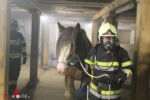 Zeitgleich kamen zwei Atemschutzgeräte-Trupps zum Einsatz. Aus dem brennenden und verrauchten dunklen Stall mussten sie die Pferde befreien. Hierbei konnten die Einsatzkräfte auf die bei vorigen Übungen erworbene Erfahrung im Umgang mit Pferden zurückgreifen. Innerhalb kürzester Zeit konnten die Pferde beruhigt und in Sicherheit gebracht werden.