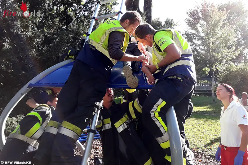 VILLACH (KTN): Kurz nach 16:30 Uhr des 21. September 2019 wurde über Notruf 122 der Einsatzzentrale Villach Stadt gemeldet, dass auf einem Spielplatz in Villach Lind ein Kleinkind bei einer Sitzgelegenheit eingeklemmt sei.