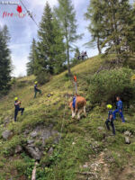 Nach kurzer Suche konnte dieses in einer ca 30 m tiefen Rinne gefunden werden. Daraufhin wurde die Freiwillige Feuerwehr Turnau verständigt, diese rückte daraufhin zwei Fahrzeugen auf die Graualm aus. Zur Unterstützung wurde die Bergrettung Turnau mit dem Quad hinzugeholt. Mittels Fahrzeugseilwinde wurde eine Seilbahn errichtet, womit das Tier problemlos auf sicheren Boden gebracht werden konnte.