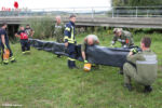 Hier galt es „kreativ“ zu denken und zu sein, um die gestellten Aufgaben zu lösen. Mit eigenen, in den Fahrzeugen vorhandenen Mitteln mussten Auffangbecken für größere Mengen „Schmutzwasser“, Ölspereren in der Pinka errichtet und Maßnahmen zum kontrollierten Ablassen von Wasser bei einer installierten Stausperre gesetzt werden.