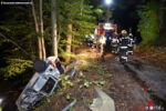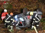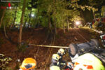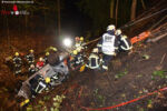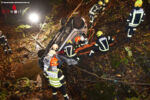 Nun begann ein perfektes Zusammenspiel der FF Einsatzkräfte beider Wehren: Fahrzeug sichern, Beleuchtung aufbauen, Gerätschaften in den steil abfallenden Grabe bringen – aber immer mit dem Gedanken der Eigensicherung im Hinterkopf. Das erste „Opfer“ war sehr schnell befreit und nach oben gebracht; nun beginnt der wesentlich schwierigere Teil der Übung: den zweiten Patient, im Gurt hängend, zu befreien. Die Lage und Beschädigung des verunfallten Autos machten diese Aufgabe zu einem komplizierten Unterfangen. Aber im Team konnte auch dies fachlich korrekt und souverän bewältigt werden.
