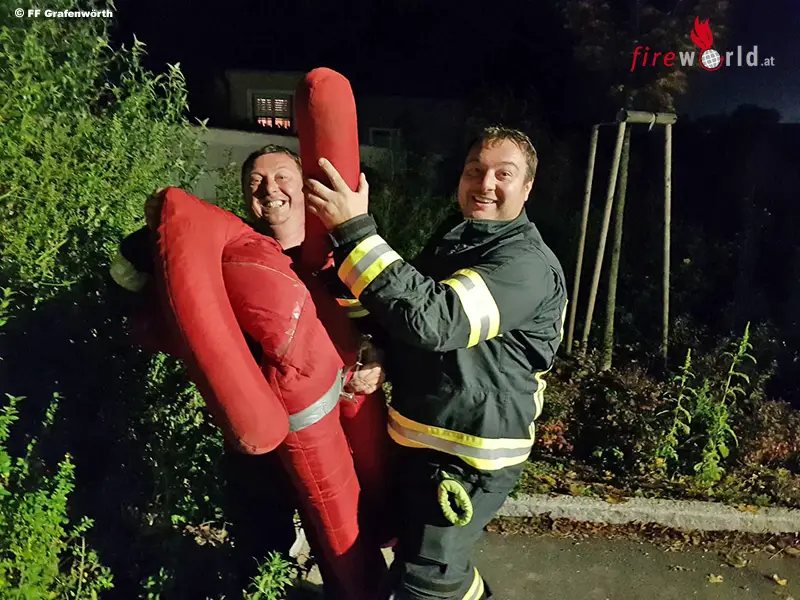 Und dann gibt’s da noch den Ausbildungsleiter der Feuerwehr Grafenwörth, der solche Dinge sieht und dabei stets eine Stimme im Kopf vernimmt: „Kann man da eine Übung draus machen?“ Man kann… Die Aufgabenstellung war eigentlich simpel: Aufgeteilt auf zwei Teams hatten die Feuerwehrleute den Auftrag unserer armen Übungspuppe zu Hilfe zu eilen. Diese befand sich gerade mal 70m weit weg, doch man erinnert sich: „Der Boden ist Lava!“