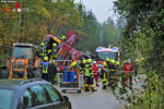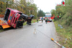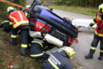 ROITHAM (OÖ): Herbstübung 2019 der Freiw. Feuerwehr Roitham im Bezirk Gmunden. Ein Auto kollidiert frontal mit einem entgegenkommenden Lkw, überschlägt sich und bleibt am Dach am Fuße einer Böschung neben der Straße liegen. Der Lastwagen gerät durch den Aufprall ins Schleudern und kippt auf den Anhänger eines entgegenkommenden Traktorgespannes.