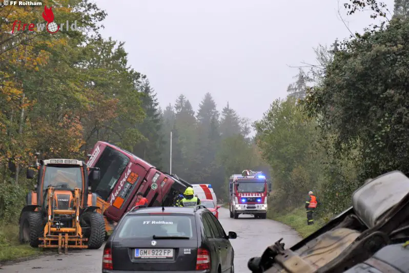 ROITHAM (OÖ): Herbstübung 2019 der Freiw. Feuerwehr Roitham im Bezirk Gmunden. Ein Auto kollidiert frontal mit einem entgegenkommenden Lkw, überschlägt sich und bleibt am Dach am Fuße einer Böschung neben der Straße liegen. Der Lastwagen gerät durch den Aufprall ins Schleudern und kippt auf den Anhänger eines entgegenkommenden Traktorgespannes.