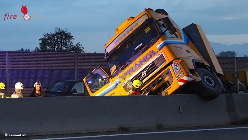 Ein Lkw-Lenker hat vermutlich ausgelöst durch einen internen Notfall die Kontrolle über seinen Schwertransporter verloren und fuhr auf die Mittelleitschiene aus Beton auf. Dort kam die Zugmaschine in Schräglage zum Stillstand. Die Feuerwehr befreite den Lenker aus der Fahrerkabine. Er wurde mit dem Notarzthubschrauber Martin 3 nach notärztlicher Erstversorgung am Unfallort ins Salzkammergutklinikum Vöcklabruck geflogen.