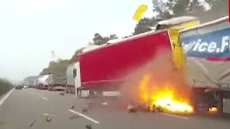 D: Lkw kracht gegen Stau-Lkw → Feuerball (Dashcam)