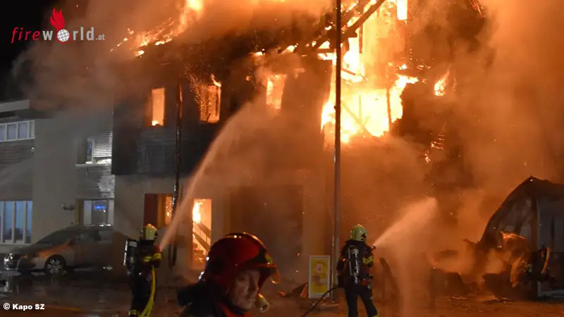 In Galgenen kollidierte der Fahrzeuglenker mit einer Verkehrsinsel und anschließend im ersten Stock mit der Fassade eines Wohnhauses. Im Unfallfahrzeug brach sofort ein Brand aus. Das Feuer sprang auf das Haus über, das vollständig ausbrannte. Die Feuerwehr konnte ein Übergreifen auf ein angebautes Gebäude verhindern.