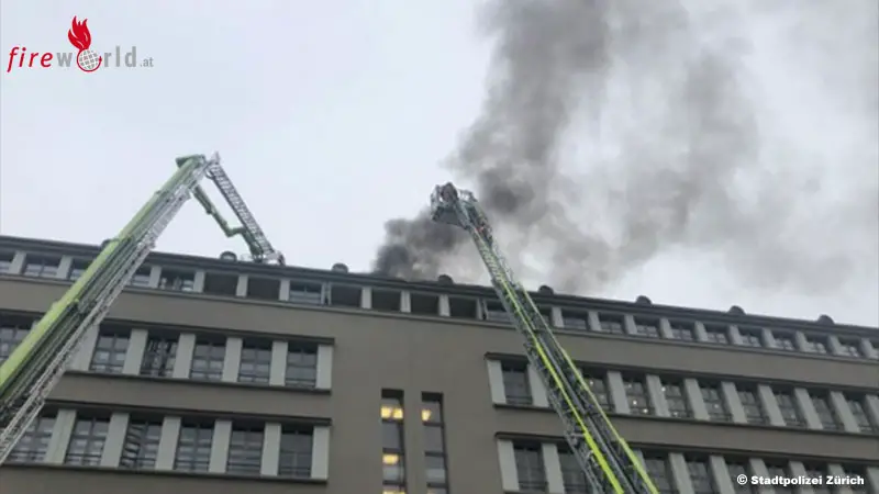 ZÜRICH (SCHWEIZ): Im Zürcher Kreis 1 ist am Montag, 25. November 2019, kurz vor Mittag ein Feuer im Dachbereich eines Gewerbegebäudes ausgebrochen. Als die Rettungskräfte eintrafen, stiegen Flammen und Rauch aus dem Kamin im Lüftungsschacht des Gebäudes auf. Mehrere Personen wurden evakuiert, es gab jedoch keine Verletzten.