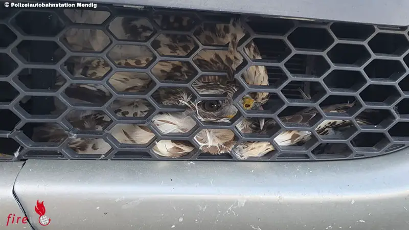 Der Vogel konnte lediglich durch Herausbrechen des Grillgitters aus seiner misslichen Lage befreit werden. Da er sich bei dem Unfall einen Flügel und ein Bein gebrochen hatte, wurde er anschließend durch die Kollegen der Autobahnstation Mendig in eine nahegelegene Tierklinik verbracht. Dem Bussard ging es den Umständen entsprechend gut. Der Sachschaden am Pkw beläuft sich auf ca. 1000 EUR.