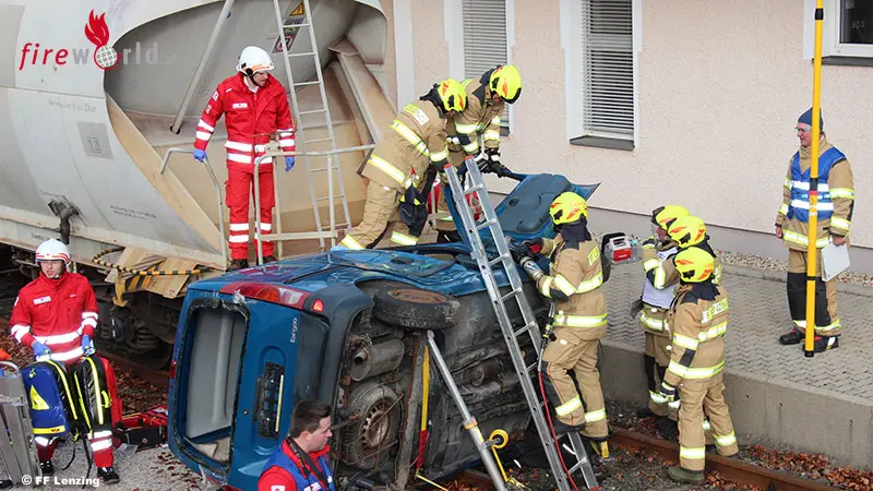 LENZING (OÖ): Am 30. November 2019 lautete der Titel des Großübungsszenarios für die Einsatzkräfte „Verkehrsunfall mit einem Gefahrengutwaggon sowie mehrere verletzte und eingeklemmte Personen“. Als Schauplatz für diese Gemeinschaftsübung wurde das Bahnhofsgelände in Lenzing gewählt.